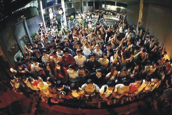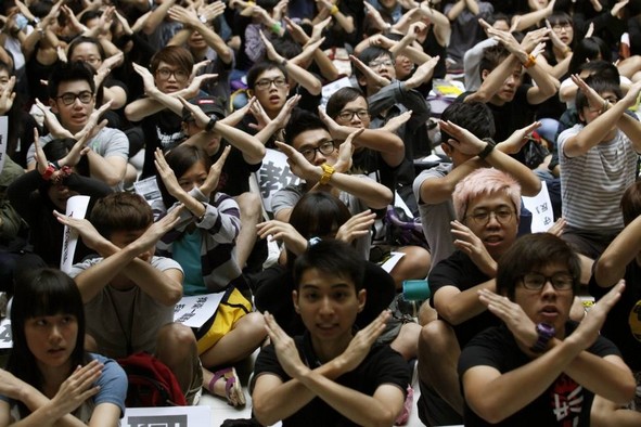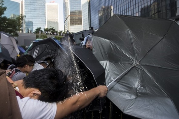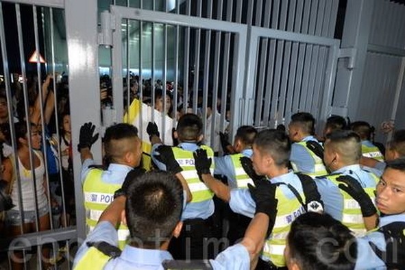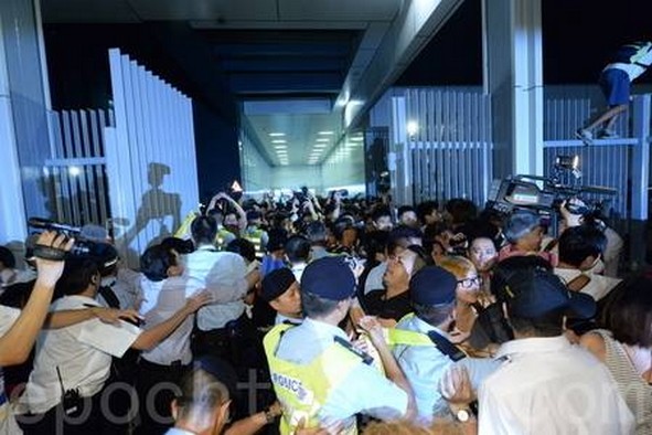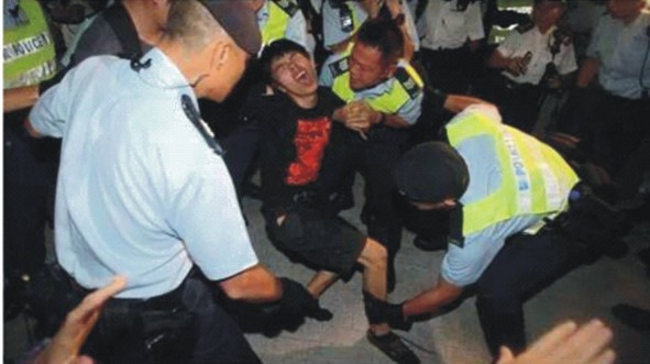 Lãnh đạo sinh viên Joshua Wong đã gào thét, đấm đá, tuôn máu trên tay khi bị cảnh sát lôi kéo đi giữa những thanh niên sinh viên khác hát to, hô vang và giành giật cứu anh.